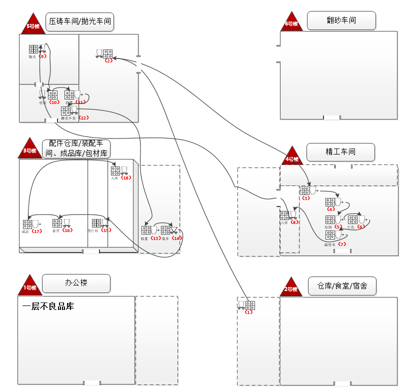 意大利面条图是通过画出员工移动的路线来识别无效的移动(图5-9)。